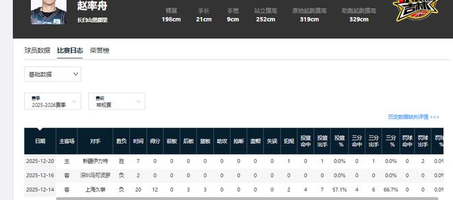 趙率舟上賽季在遼寧隊屬於邊緣替補,上場機會寥寥無幾,場均隻能獲5.4分鍾的出場時間。因此,在休賽期趙率舟被遼籃當作交易籌碼送到了吉林男籃,而他在新東家目前是高開低走。