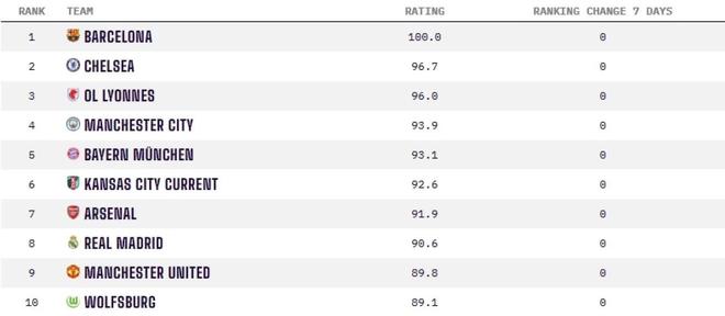 在本次排名中,巴塞羅那女足以滿分100分的強勢表現穩居世界第一。切爾西女足以96.7分位列第二,裏昂女足以96.0分排名第三。